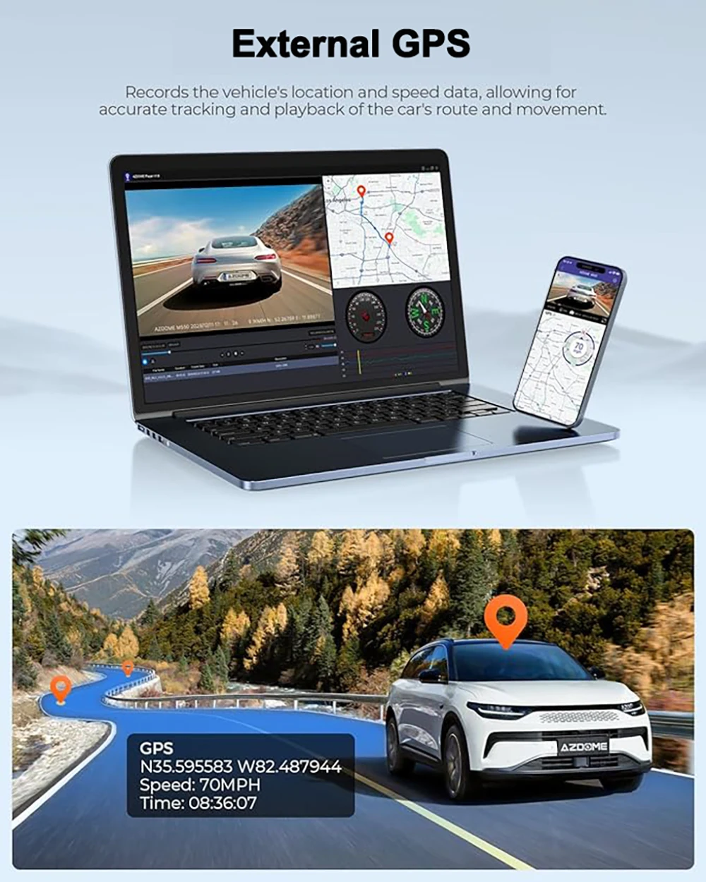 يتصل مسجل السيارة بنظام تحديد المواقع الخارجي (GPS) لتحديد موقعك في الوقت الفعلي، مما يجعل رحلتك أكثر أمانًا.
